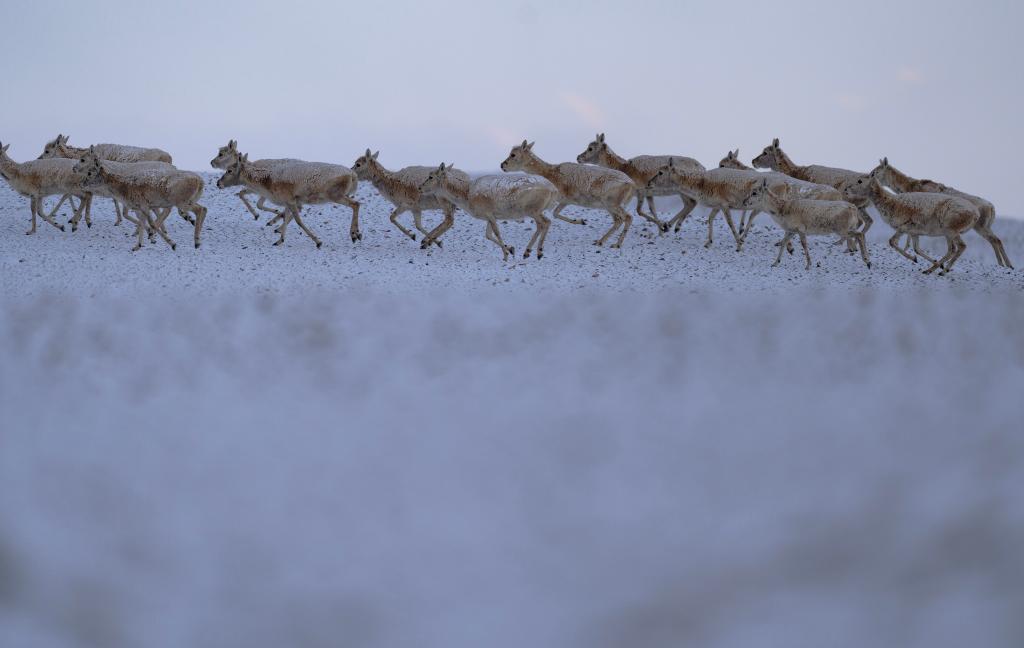 6月15日清晨雪后,在羌塘國家級(jí)自然保護(hù)區(qū),迎著朝霞前行在遷徙路上的一群藏羚羊。