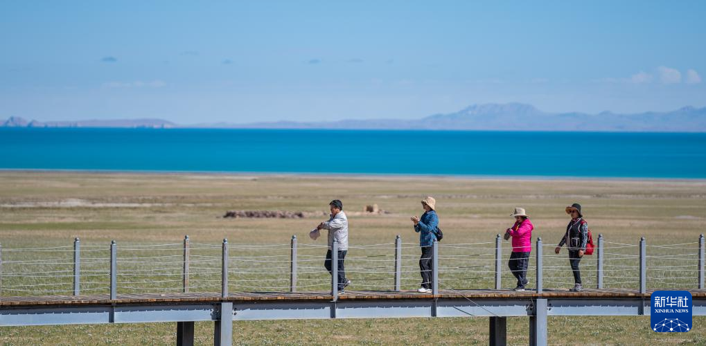 6月22日,游客在色林錯(cuò)湖畔的觀景棧道上漫步。新華社記者 丁增尼達(dá) 攝