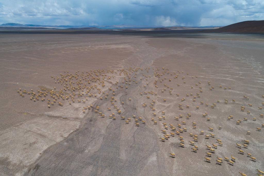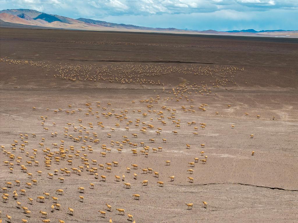 2024年5月10日,在羌塘國家級自然保護(hù)區(qū),大群懷孕的雌性藏羚羊開始集結(jié)成群,向產(chǎn)羔地遷徙。