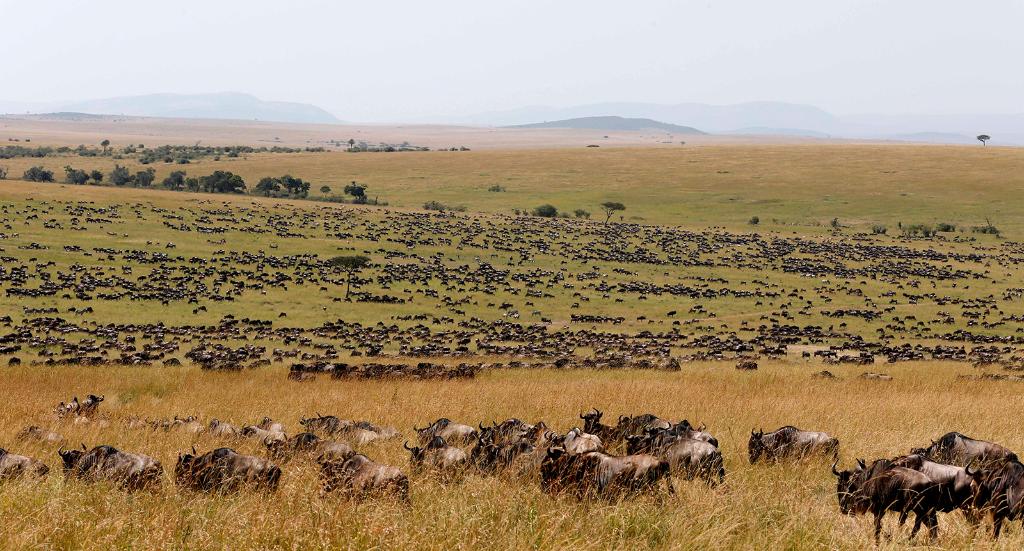 在馬賽馬拉國家保護(hù)區(qū),遷徙中的野生動物在草原上覓食。
