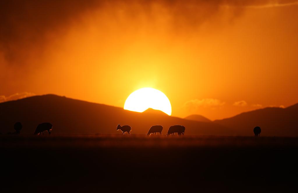 在羌塘國家級自然保護(hù)區(qū),藏羚羊在夕陽下覓食。