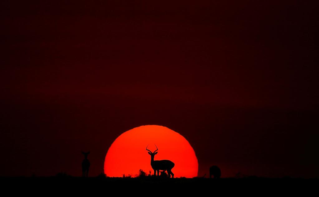 在馬賽馬拉國家保護(hù)區(qū),遷徙中的野生動物在夕陽下覓食。