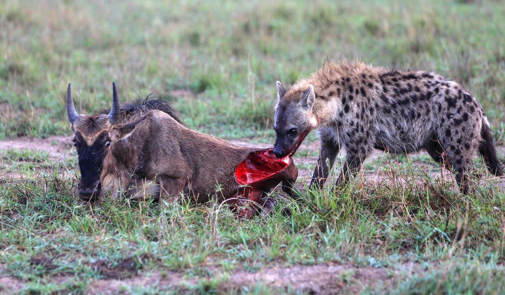 在馬賽馬拉國家保護(hù)區(qū),一頭遷徙中的角馬成了鬣狗的食物。在角馬遷徙過程中,獅子、獵豹、花豹、鬣狗以及馬拉河中的鱷魚等掠食動物環(huán)伺其周,伺機(jī)而動。