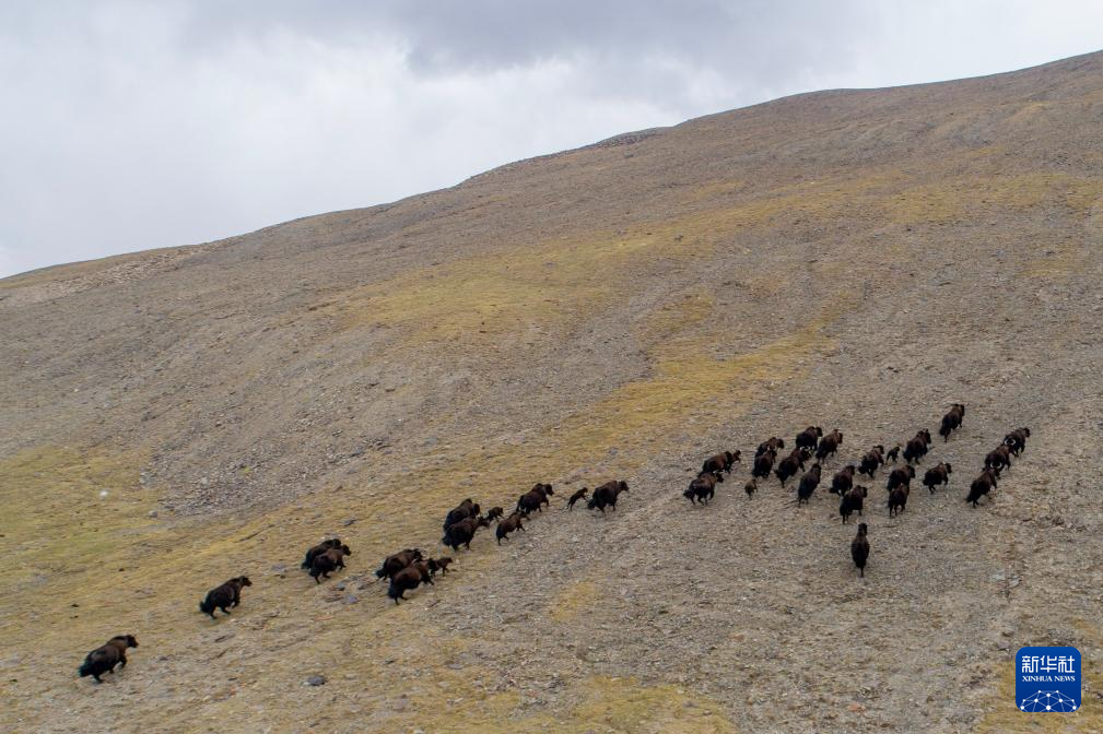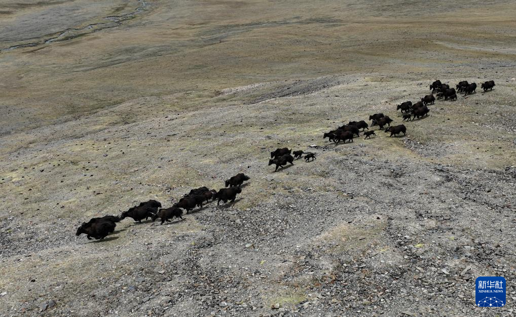 這是在那曲市尼瑪縣拍攝的野牦牛群,其中有剛出生不久的小牛犢(無人機照片,6月15日攝)。新華社記者 旦增尼瑪曲珠 攝
