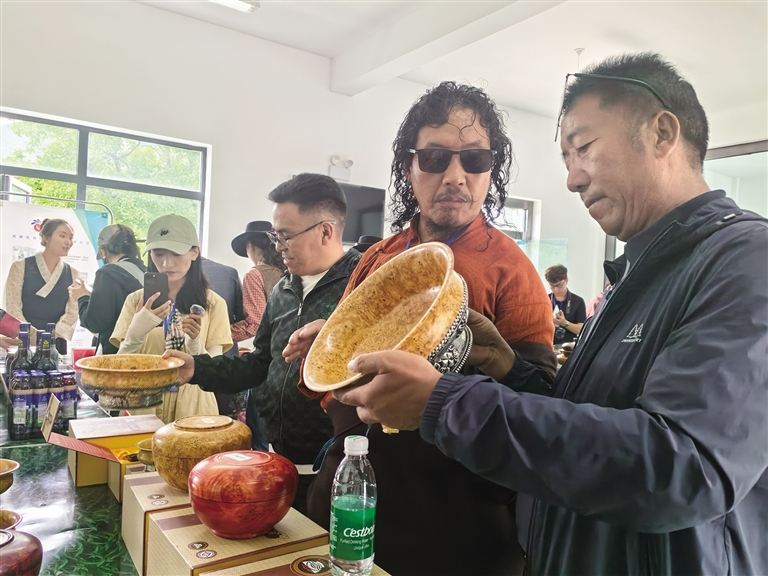探訪團一行前往西藏山南加查達布傳統(tǒng)文化產(chǎn)業(yè)發(fā)展有限公司探訪加查木碗的制作技藝。在該公司的展廳內(nèi),西藏自治區(qū)級加查木碗非遺傳承人、公司負責(zé)人桑珠向探訪團詳細講解了加查木碗從選材、切割、打磨到雕刻的每一個制作環(huán)節(jié)。桑珠拿起一個個造型各異、原材料不同的木碗向探訪團介紹著木碗的品質(zhì)分辨技巧、用處等。楊樹、松樹、柏樹……一塊塊承載著歲月的木頭,經(jīng)過木匠們的一道道復(fù)雜的工序后,變成了精美的藝術(shù)品?!斑@種碗面像圓珠筆點涂的是上等木料制成的精品,最低售賣價值可達到4000元一個?!鄙V檎f,“現(xiàn)在來買木碗的人越來越多,很多游客也會買回去當(dāng)伴手禮。這讓我更加堅定了傳承和發(fā)展這項技藝的決心。”