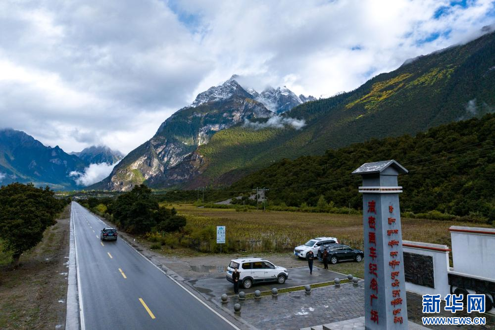 10月11日拍攝的波密通車(chē)紀(jì)念廣場(chǎng)(無(wú)人機(jī)照片)。2020年,西藏波密縣通過(guò)查閱文獻(xiàn)史料、比對(duì)老照片、咨詢(xún)當(dāng)?shù)乩先?、遠(yuǎn)程連線老一輩同志等方式,考證出當(dāng)時(shí)舉行通車(chē)典禮的地點(diǎn)為今波密縣松宗鎮(zhèn)角達(dá)村國(guó)道318旁。為紀(jì)念這一歷史事件,2021年4月波密縣在此處修建了波密通車(chē)紀(jì)念廣場(chǎng)。新華網(wǎng) 旦增努布 攝
