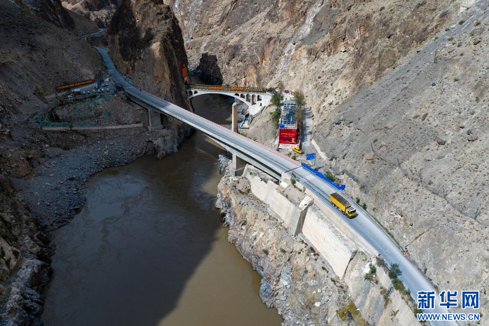 俯瞰通麥路段上的三座建于不同時(shí)期的橋(10月10日攝 無(wú)人機(jī)照片)。位于西藏林芝市波密縣境內(nèi)的川藏公路通麥路段,曾被稱(chēng)為“通麥天險(xiǎn)”。新華網(wǎng) 旦增努布 攝