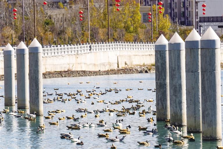 開闊的河面上,斑頭雁、黃鴨、赤麻鴨等鳥類往來于此,此起彼伏的叫聲不絕于耳。在陽光的照射下水面波光粼粼,候鳥或嬉游、或覓食、或追逐,這一和諧優(yōu)美的景象,引得不少觀賞的市民和游客舉起手機或相機記錄。