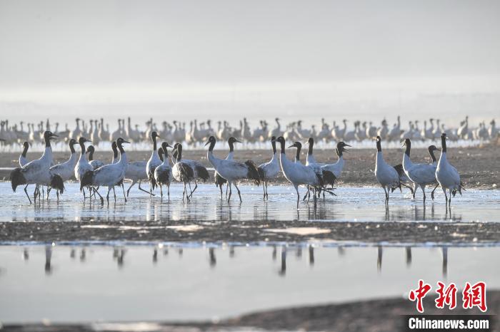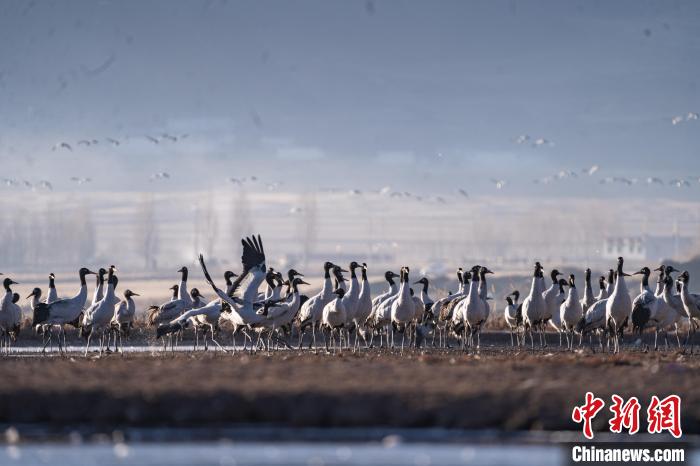 11月27日晨,西藏自治區(qū)拉薩市林周縣黑頸鶴保護(hù)區(qū)內(nèi),大量越冬的黑頸鶴在虎頭山水庫(kù)覓食、嬉戲。林周縣位于拉薩河上游及澎波河流域,平均海拔約4200米,是黑頸鶴的主要越冬地之一。中新社記者 貢嘎來(lái)松 攝