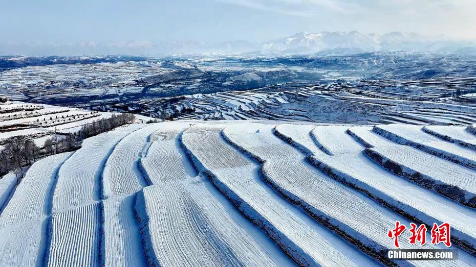 高原春日,青海省海東市互助土族自治縣東山鄉(xiāng),一場(chǎng)春雪過后,山巒、梯田在航拍鏡頭下宛若“大地指紋”。圖為山巒、田地被白雪覆蓋。