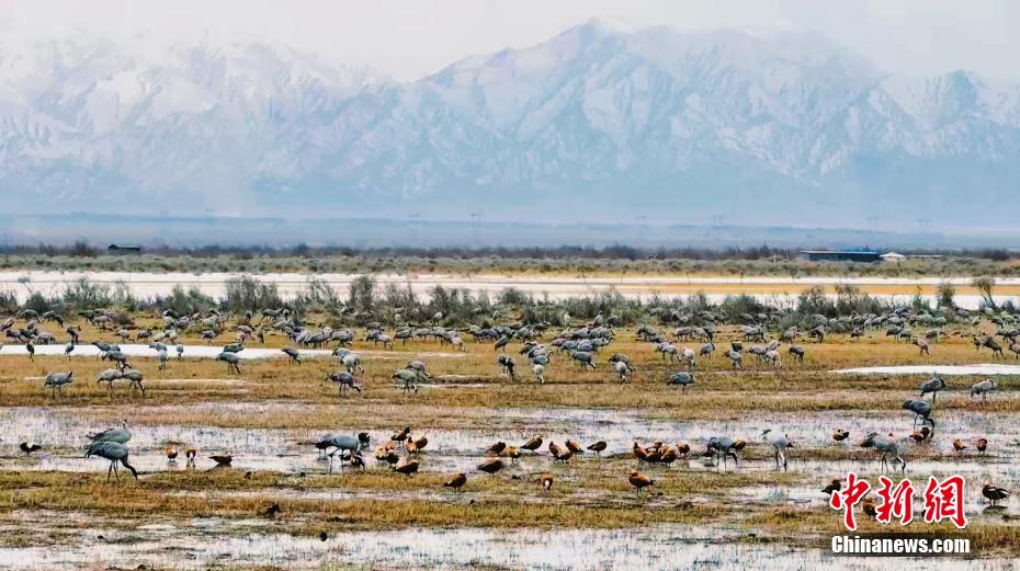 連日來(lái),成群灰鶴聚集于青海省海西蒙古族藏族自治州都蘭縣巴隆鄉(xiāng)鐵絲蓋地區(qū)。灰鶴是國(guó)家二級(jí)重點(diǎn)保護(hù)野生動(dòng)物。圖為灰鶴等野生鳥(niǎo)類群在濕地休憩。
