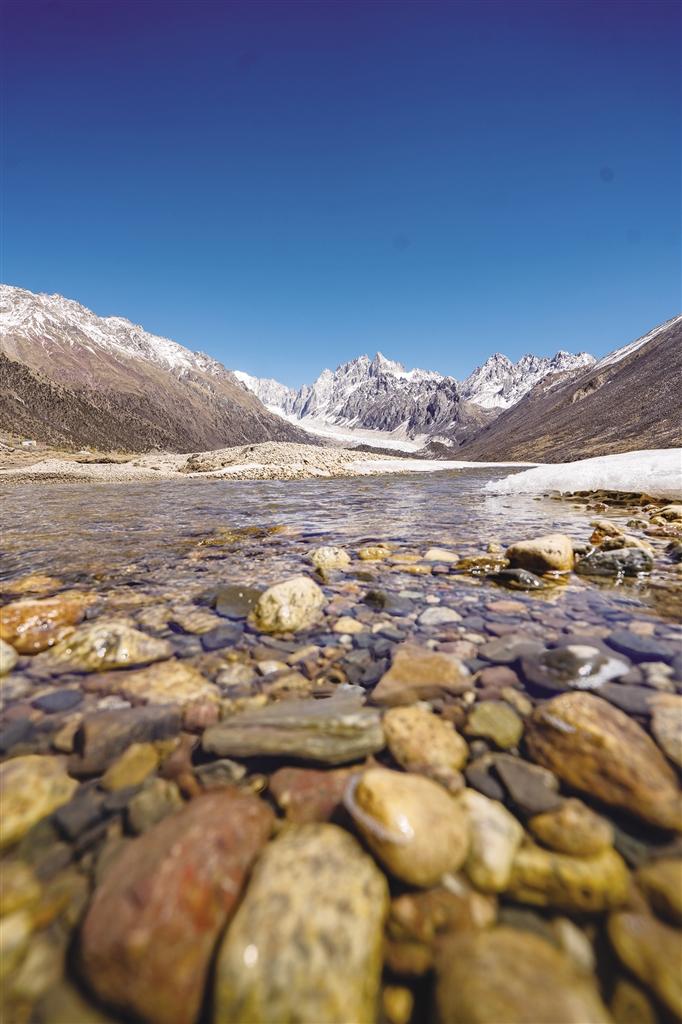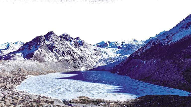 三月下旬,冰凍的湖泊已微微融化,冰面上覆著一層薄薄的冰沙,踩上去沙沙作響。布加雪山、焫茸冰川及冰川腳下的冰磧湖層層疊疊、相映成趣。冰川周邊山體的沙石裸露在外,隱約可見(jiàn)這座冰山在歲月中變化、侵蝕的痕跡。