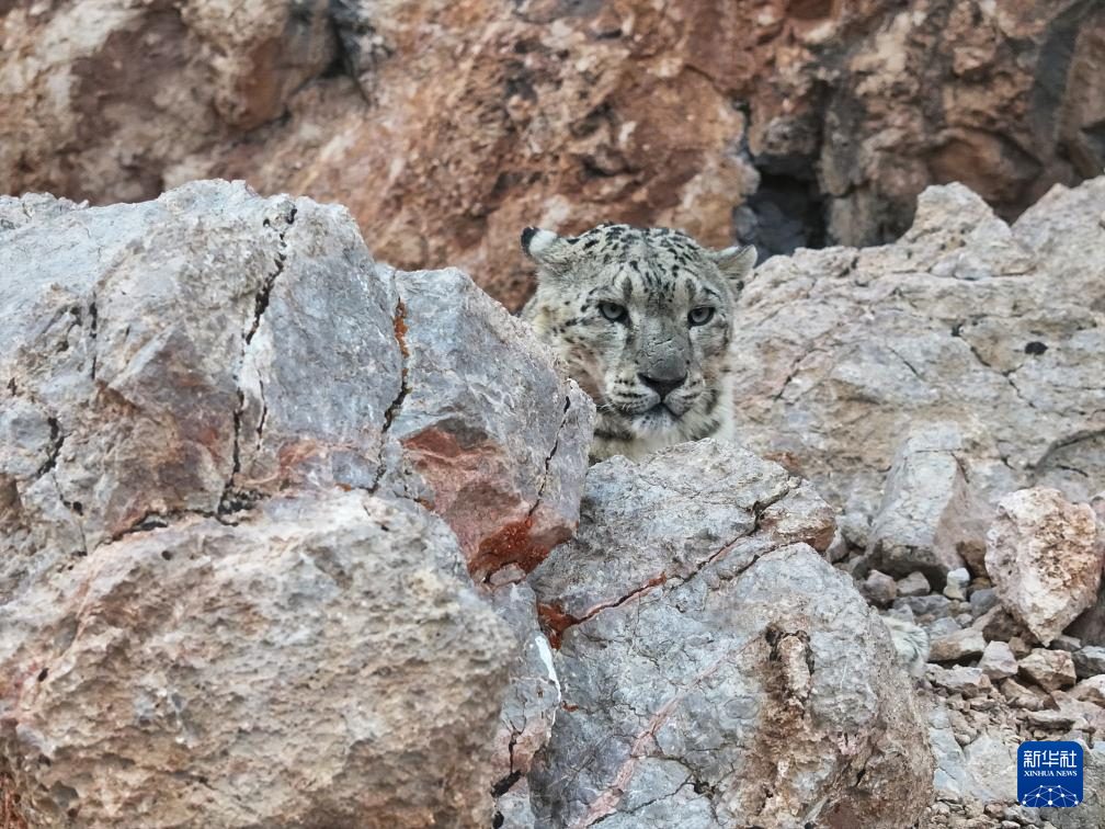 西藏阿里改則縣改則鎮(zhèn)玉多村附近巖山區(qū)域拍攝到的國家一級保護動物雪豹(4月18日攝)。新華社發(fā)(索朗仁青 攝)