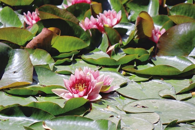 “移舟水濺差差綠,倚欄風搖柄柄香?!弊哌M柳梧國際總部城院內(nèi),在停車場的東側,一池蓮花在層層蓮葉的襯托下開得正盛。走近池邊,蓮葉特殊的淡淡香味夾雜著潮濕的水汽撲面而來。粉、白的蓮花在幾場雨過后,迎著陽光依次綻放。幾個孩子在池邊嬉戲追逐,時不時用手挑起水花四濺,遠遠看去,頗有“小姑貪戲采蓮遲”的意味。