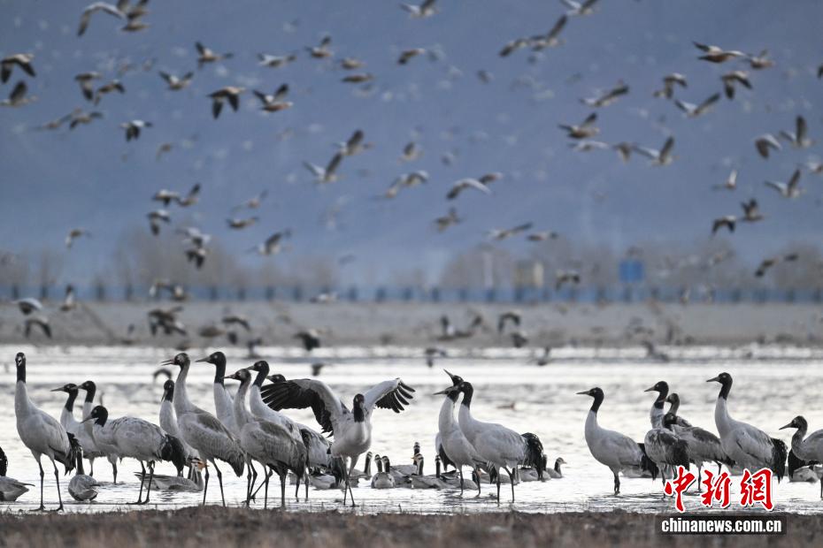 11月26日,位于西藏自治區(qū)拉薩市林周縣的黑頸鶴自然保護(hù)區(qū)內(nèi),大量越冬的黑頸鶴在卡孜水庫(kù)、農(nóng)田、濕地里覓食、嬉戲。林周縣位于拉薩河上游及澎波河流域,是黑頸鶴的主要越冬地之一。中新社記者 貢嘎來(lái)松 攝