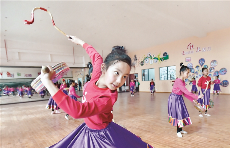5月4日,西藏自治區(qū)青少年宮在拉薩揭牌。圖為孩子們在西藏自治區(qū)青少年宮內學習藏族傳統(tǒng)熱巴舞。 新華社記者 覺 果攝