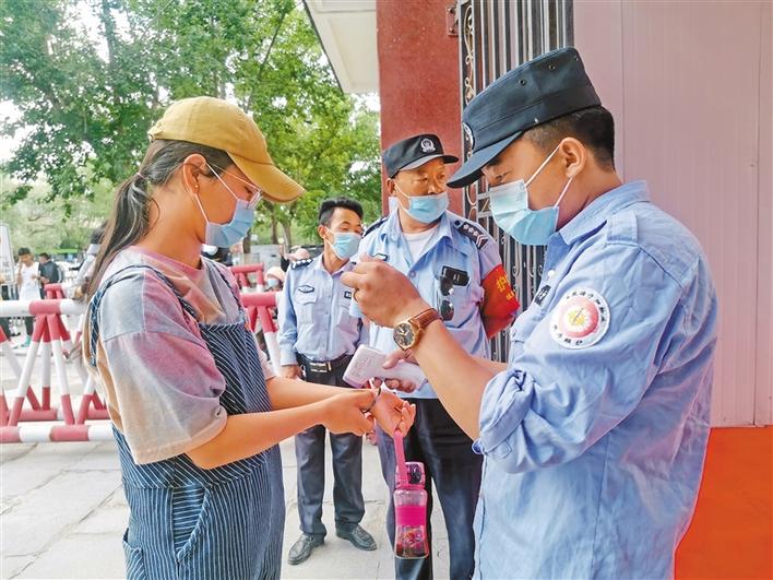 圖為在拉薩中學(xué)考點(diǎn)門口,工作人員對即將進(jìn)入考點(diǎn)熟悉環(huán)境的考生進(jìn)行體溫檢測和身份驗(yàn)證。記者 王莉 攝