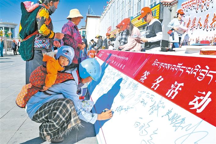獅泉河鎮(zhèn)群眾在“民族團(tuán)結(jié)月”簽名板上簽下自己的名字。 溫凱 洛桑旦增 扎西羅布 攝