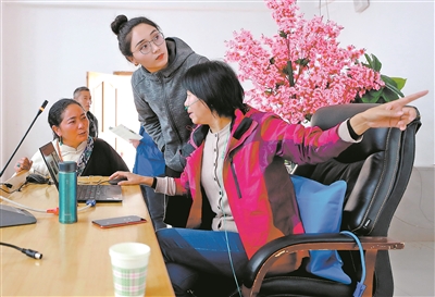 培訓(xùn)過程中,授課專家、中國教育科學(xué)研究院教師發(fā)展研究所副所長卿素蘭博士(右一)由于高原反應(yīng),身體出現(xiàn)不適,桑丁卓瑪臨時客串起“助教”,幫助調(diào)試教學(xué)設(shè)備、進行范文朗讀等。