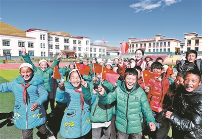 和學(xué)生們在一起,是桑丁卓瑪最開心的時刻。她專門給學(xué)生帶來國旗、國旗貼,為他們講述國旗下民族團結(jié)好故事。