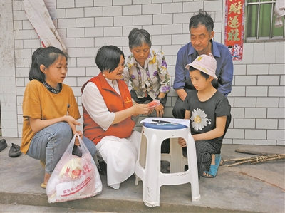 2020年6月21日,張彥杰(左二)為明揚鎮(zhèn)父母雙殘的孩子黎俊秀及妹妹送去2000元助學(xué)金。本版照片除署名外均由受訪者提供