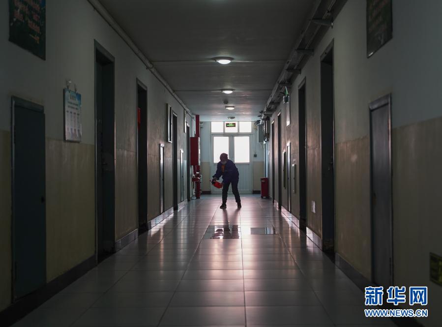 2月8日,工作人員在北京交通大學22號公寓樓道內(nèi)進行消殺。新華社記者 張浩波 攝