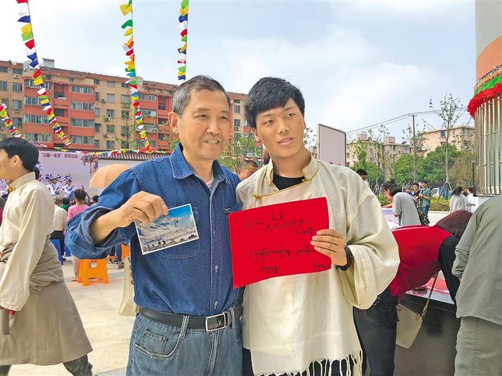 圖為江蘇省南通中學(xué)藏文化社團在南通市北濠社區(qū)開展藏文化宣傳與展示活動時,藏族學(xué)生把藏文書寫的明信片贈送給當(dāng)?shù)厥忻瘛?圖片由江蘇省南通中學(xué)提供