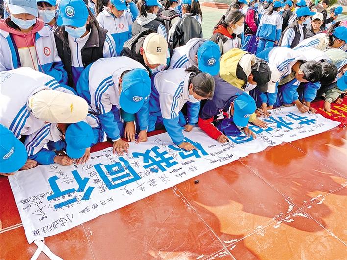 圖為學(xué)生們?cè)跅l幅上簽名,許下節(jié)水愛水的承諾。錢加典 王珊 攝