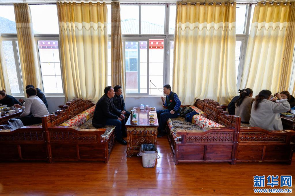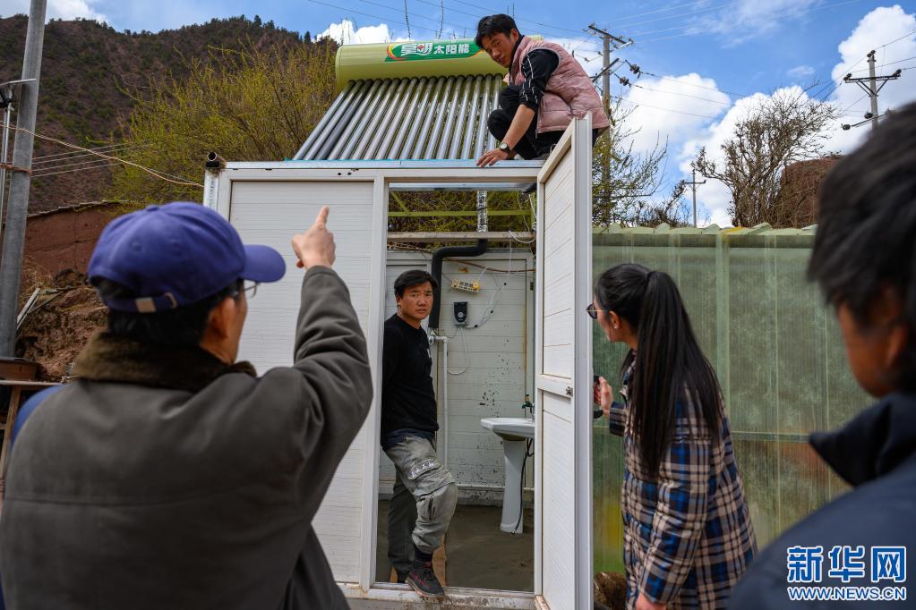5月2日,在西藏昌都市類烏齊縣濱達鄉(xiāng)濱達村,李純民(左二)在當?shù)卮迕裣虬桶偷牵ㄓ叶┘抑胁榭凑託夤薜氖褂们闆r。新華社記者 劉金海 攝