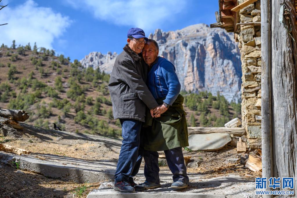 5月3日,李純民前往西藏昌都市類烏齊縣伊日鄉(xiāng)崩日村看望1979年下鄉(xiāng)工作時結識的房東一家。這是房東的大兒子澤仁多加(右)在家門口熱情歡迎他。新華社記者 劉金海 攝