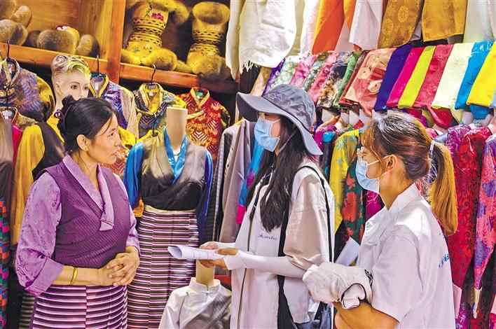 圖為實踐隊在拉薩八廓街古城朵究蒼藏裝店,了解藏裝的面料、穿法等情況。易祥瑞 攝