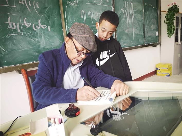 老師正在教學(xué)生藏文書法。記者 張雪芳 攝影報道