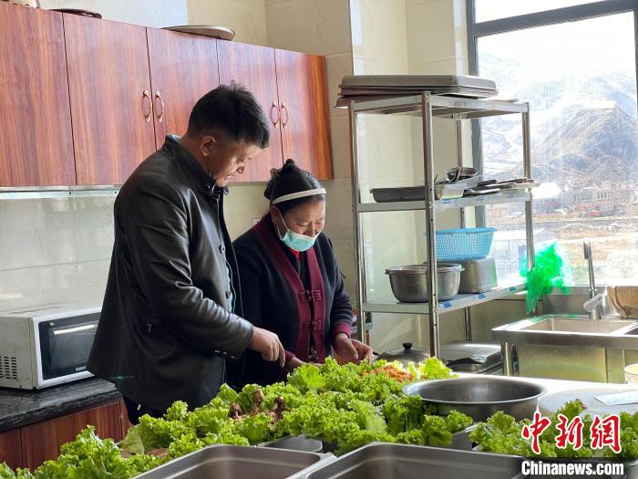圖為達(dá)旦(左)正在查看“愛(ài)心午餐”的備餐情況。 謝牧 攝