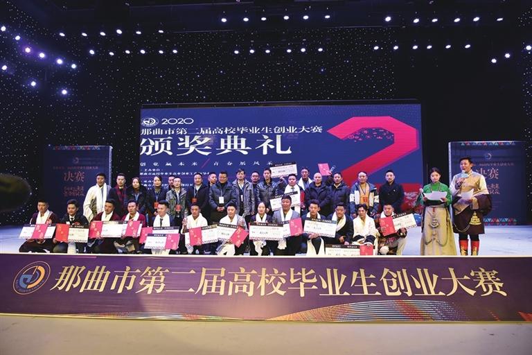 圖為那曲市第二屆高校畢業(yè)生創(chuàng)業(yè)大賽頒獎(jiǎng)現(xiàn)場。