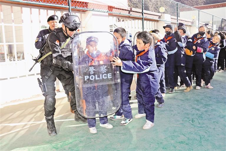 圖為比如縣公安局民警正在為比如縣第三小學(xué)五年級的學(xué)生講解警用盾牌的使用方法。記者 萬靖 攝