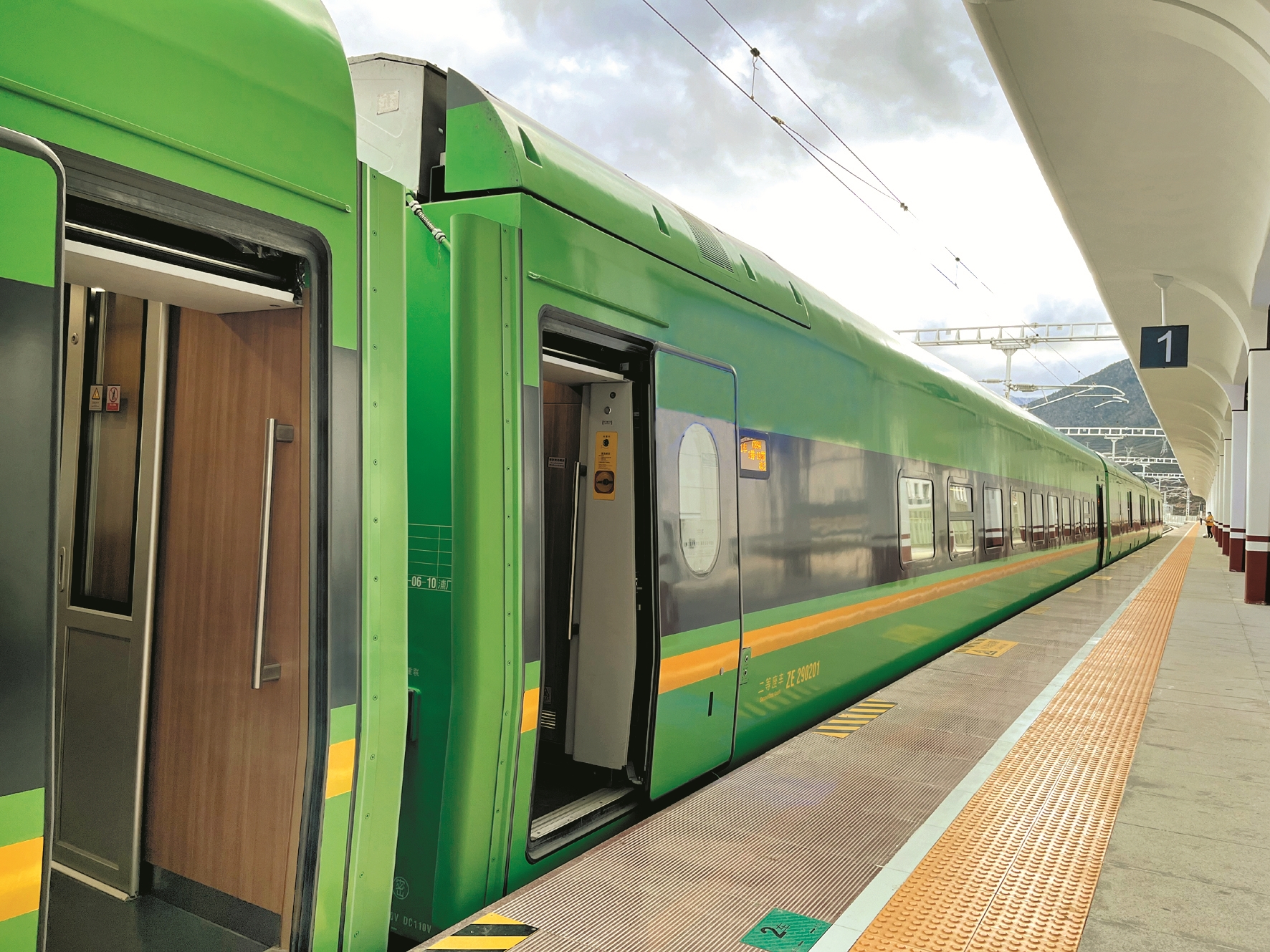 拉林鐵路是我國首列雪域高原電氣化鐵路,開通了拉薩至林芝九個中間客貨辦理站點,包括拉薩、貢嘎、山南(桑日)、加查、朗縣、米林、林芝等。列車穿行在岡底斯山和喜馬拉雅山中的藏南谷地,途經(jīng)三個市七個縣(區(qū)),全長435.48公里,設(shè)計時速160公里,設(shè)定商務(wù)座、一等座、二等座三個等次,中間編掛拖車,編組為12輛,定員755人。