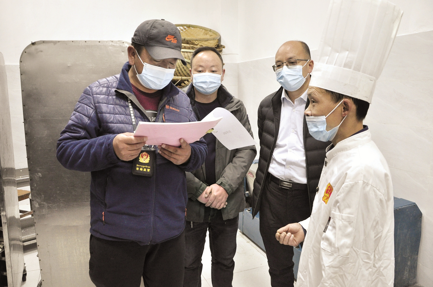 市市場監(jiān)督管理局執(zhí)法人員一行來到拉薩市北京中學學生食堂,檢查餐廳環(huán)境衛(wèi)生,隨后來到食堂后廚,查看后廚地面、廚房用具、食材操作間和食品加工工藝流程,現(xiàn)場檢查了消毒柜、食品留樣柜以及索證索票記錄本,指出其中存在的問題。拉薩市北京中學食堂負責人陳小芹告訴記者:“通過今年的招標,拉薩市北京中學的食材供貨商從拉薩凈土更換為地球第三極。如果食材出現(xiàn)任何問題,他們會立刻進行更換。我們會按照市市場監(jiān)督管理局和市教育局的要求,做好食品安全、防疫等各項工作。”