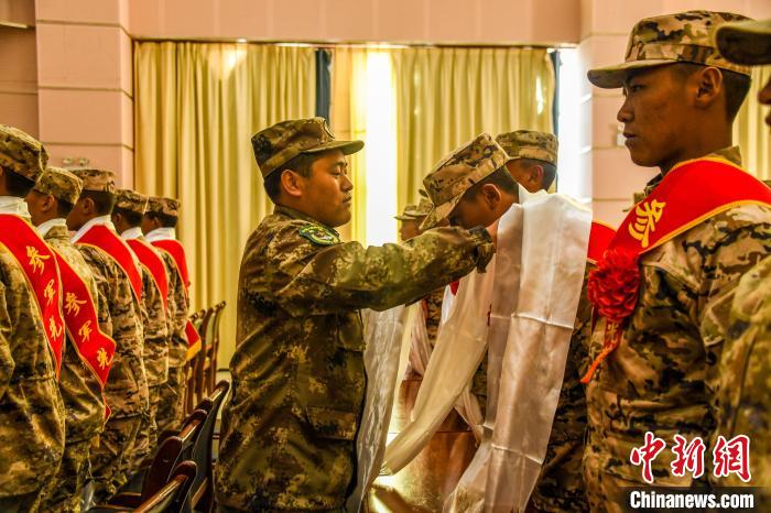 圖為為入伍新兵獻(xiàn)哈達(dá)?!≈斐?攝