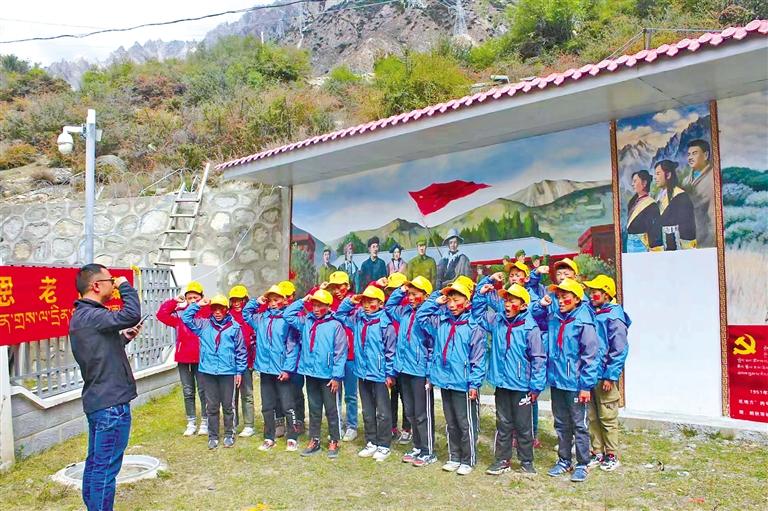 圖為鄉(xiāng)黨委干部引領學生在學?!笆酌婕t墻”旁重溫少先隊員誓詞。記者 索朗瓊珠 次仁片多 攝