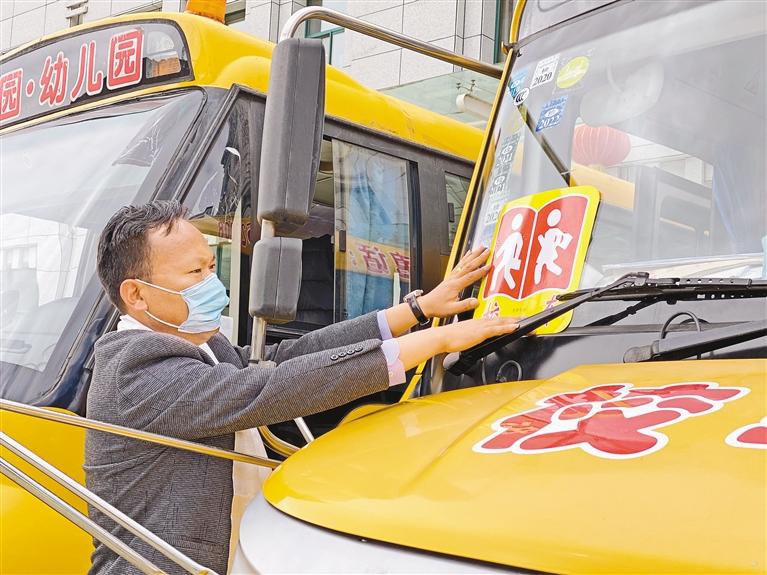 圖為游樂園幼兒園校車司機給校車擺放車輛許可證。記者 鹿麗娟 攝