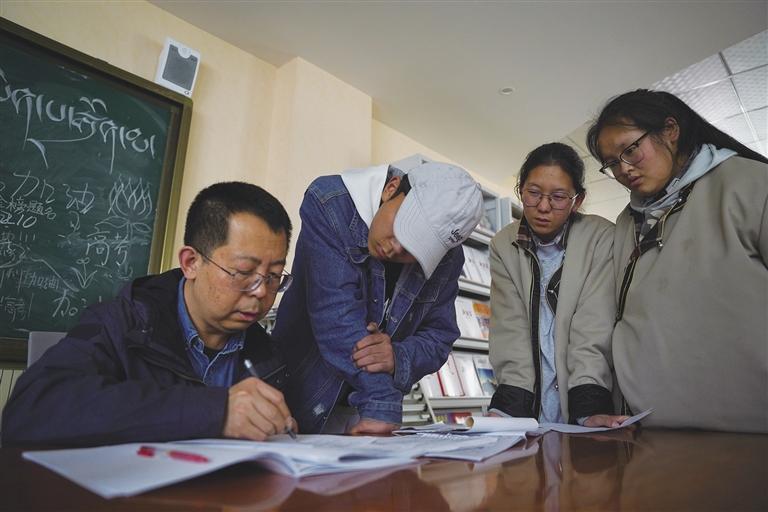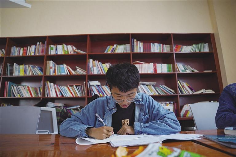 除了教室,閱覽室也是學習的好地方。在閱覽室,不少同學正奮筆疾書,只聽得見書頁翻動和筆尖書寫的“沙沙”聲。陽光透過玻璃傾瀉在書桌上,暖暖地照在這些青春的面龐,把他們點綴成五月里最美的風景。閱覽室的最里邊,一位老師正在認真講解試卷上的難題,不一會兒同學們就露出了恍然大悟的表情?!拔液芟矚g來閱覽室學習,這兒比教室更安靜些,可以讓我靜下心來做題。”學生扎西江村說。