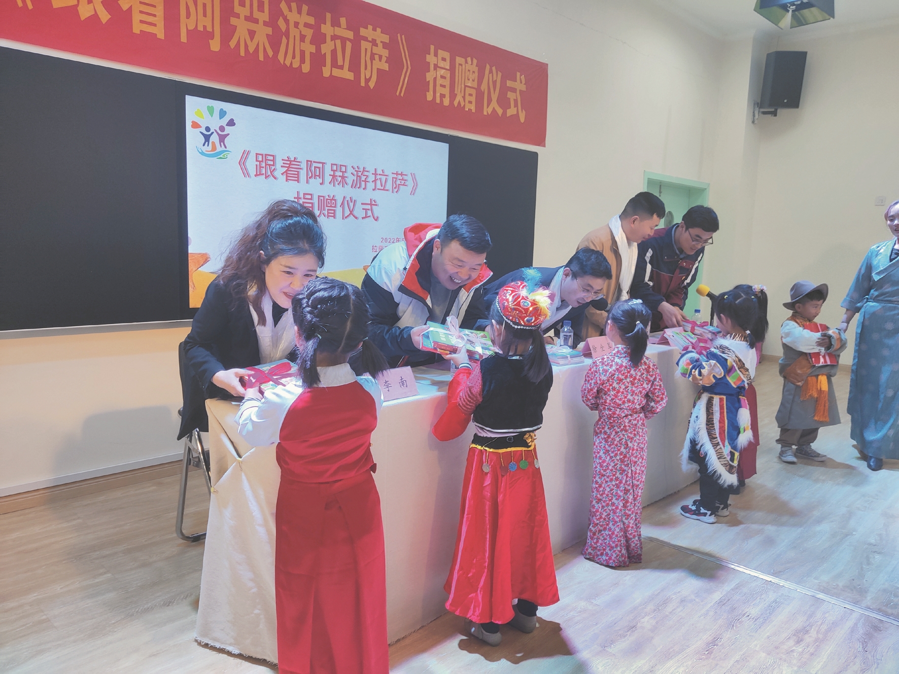 圖為捐贈儀式上,幼兒代表上臺領(lǐng)取繪本。 拉薩融媒記者 余洋洋攝
