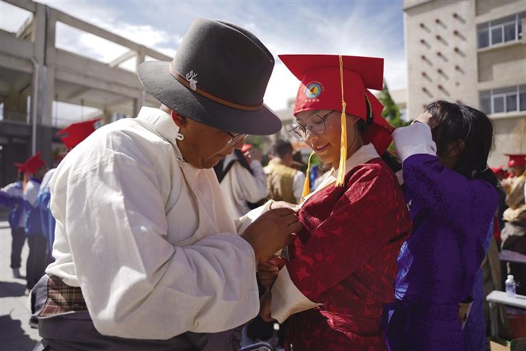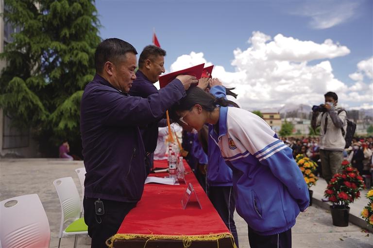 冠笄之禮,是中華民族重要的文化遺產(chǎn),更是長大成人的象征?;顒又校瑢W(xué)們戴上成人禮帽,以成人的姿態(tài)、豪邁的語調(diào)向著鮮艷的五星紅旗莊嚴(yán)宣誓,向祖國、向社會、向未來作出了莊重的承諾。拉薩市第四高級中學(xué)副校長陸彭飛對這群充滿蓬勃朝氣和無限希望的學(xué)子們表達了衷心的祝愿,他希望同學(xué)們懷揣感恩之心,敢于拼搏、勇于超越,用奮斗給自己最美的青春交上一份滿意的答卷。