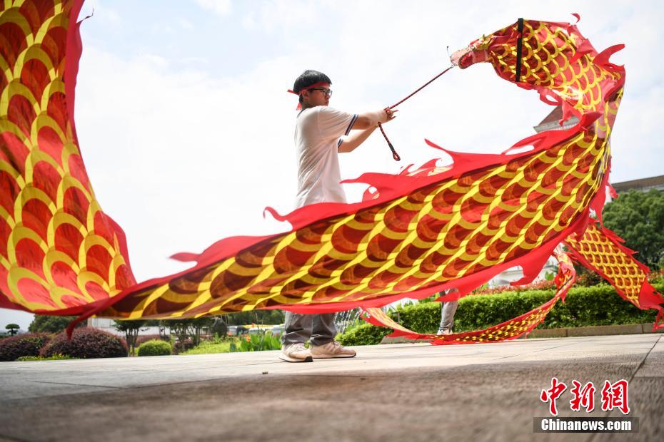 資料圖:低年級的學生為考生舞龍加油。 楊華峰 攝