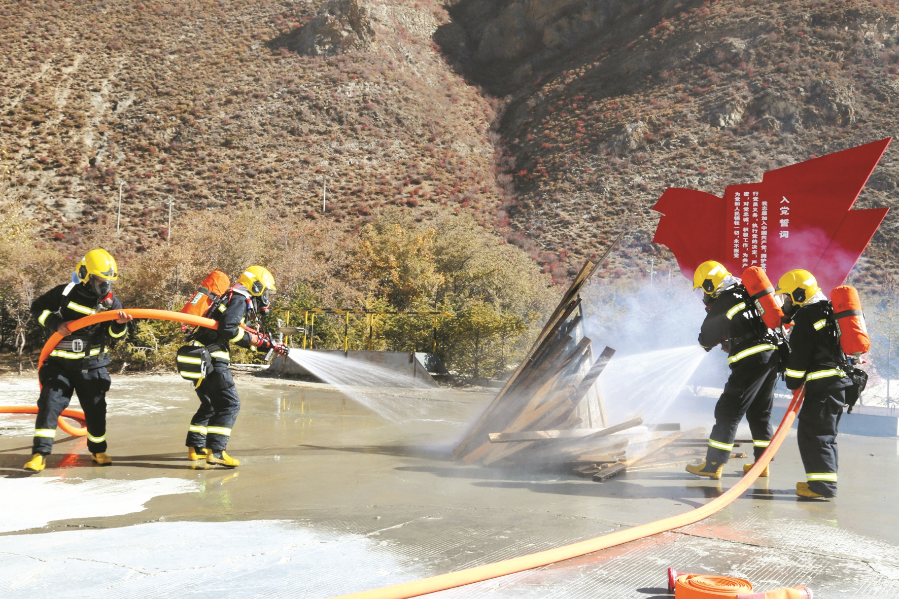 圖為啟動(dòng)儀式現(xiàn)場(chǎng),消防員進(jìn)行滅火救援演練。拉薩融媒通訊員德吉卓嘎攝