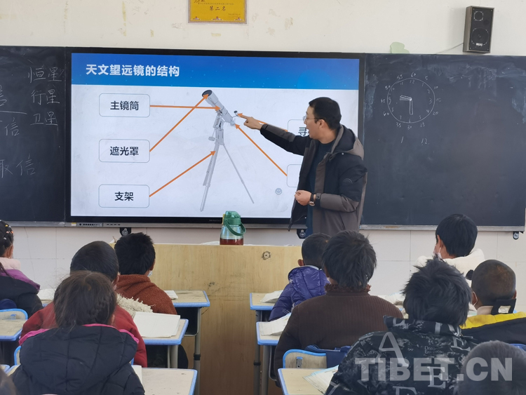 11月30日,王建煜受邀來到海拔4300多米的騾子溝小學(xué),帶著天文設(shè)備為牧區(qū)孩子們上了一節(jié)望遠(yuǎn)鏡觀測入門課。王建煜通過PPT展示了豐富的天文社團(tuán)活動,引起了孩子們強(qiáng)烈的好奇心和探索心。他介紹到,要想觀測到遙遠(yuǎn)的地方,必須要借助工具,而天文望遠(yuǎn)鏡,就是我們觀測星空的工具。