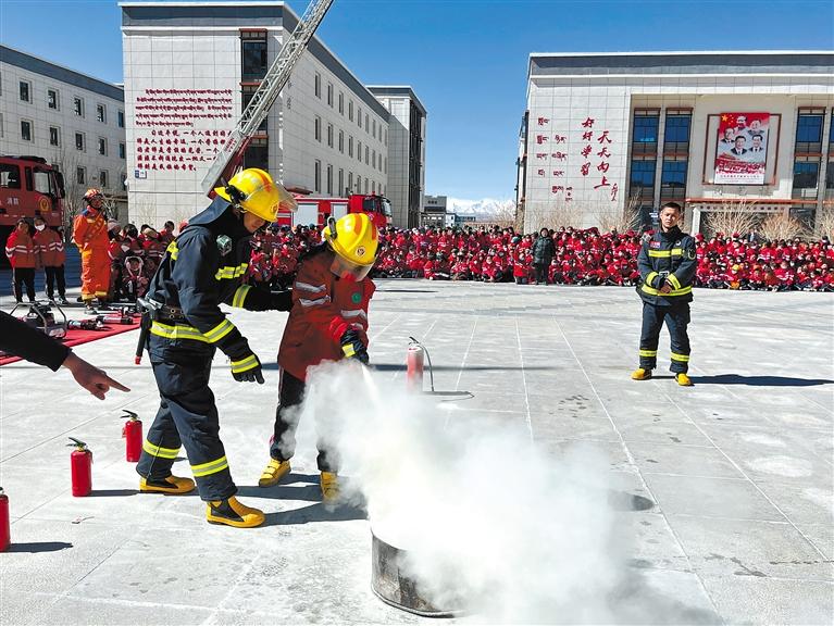 阿里陜西實(shí)驗(yàn)學(xué)校學(xué)生在“開(kāi)學(xué)第一課”中體驗(yàn)消防滅火技能。普珍 記者 洛桑旦增 攝