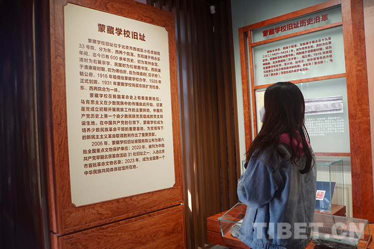 舊址西院,“蒙藏學(xué)校舊址專題展”主要展示舊址歷史沿革和革命活動(dòng),蒙藏學(xué)校學(xué)生參加五四運(yùn)動(dòng);李大釗、鄧中夏、趙世炎等對(duì)蒙藏學(xué)校青年的馬克思主義啟蒙和革命引導(dǎo);烏蘭夫、多松年 等 蒙藏學(xué)校進(jìn)步青年參加校內(nèi)外革命活動(dòng)……突出展現(xiàn)中國共產(chǎn)黨成立后在這里組織開展革命斗爭的歷史?!爸腥A一脈 同心筑夢(mèng)”主題展分為“共同締造新中國”“團(tuán)結(jié)建設(shè)新社會(huì)”“攜手奮斗繁榮路”“同心奮進(jìn)新時(shí)代”4個(gè)部分。展出照片420多幅,實(shí)物、文獻(xiàn)、檔案280余件,藝術(shù)展 項(xiàng) 18項(xiàng),重點(diǎn)展示新時(shí)代民族工作取得的新的歷史性成就。