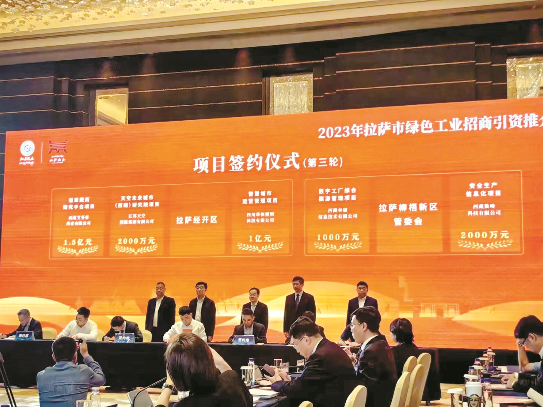 4月17日,2023年拉薩市綠色工業(yè)招商引資推介會暨項目簽約儀式在南京舉行,活動由拉薩市人民政府、西藏自治區(qū)招商局、江蘇援藏前方指揮部主辦,拉薩市商務局、拉薩經(jīng)濟技術開發(fā)區(qū)聯(lián)合承辦。江蘇省商務廳副廳長倪海清、江蘇省工業(yè)和信息化廳二級巡視員宋旭東、西藏自治區(qū)招商局副局長次旦格來應邀出席活動并致辭,簽約企業(yè)代表、拉薩市各縣(區(qū))、經(jīng)濟功能園區(qū)分管招商工作負責人以及知名企業(yè)代表近140余人參加推介會。本次推介會共簽約項目15個,協(xié)議投資達32.3億元。