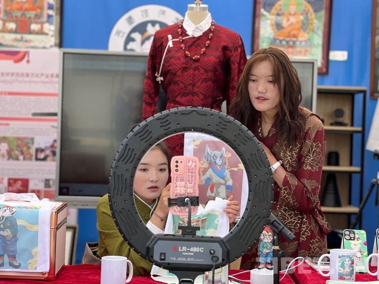在展示交流區(qū),兩名穿著藏裝的姑娘正在通過直播向觀眾介紹有十二生肖圖案的被子、手機(jī)殼、筆記本等各類產(chǎn)品,也吸引著現(xiàn)場嘉賓前來參觀?!斑@些作品是民族文化產(chǎn)業(yè)系學(xué)生的作品,圖案都是學(xué)生自己繪畫的原創(chuàng)文創(chuàng)產(chǎn)品?!蔽鞑丶紟煂W(xué)院數(shù)字信息產(chǎn)業(yè)系教師桑珍介紹,“兩位姑娘是21級(jí)電商專業(yè)學(xué)生,通過這次活動(dòng)一方面希望自己得到鍛煉,另一方面也是為7月份的電商大賽做前期的培訓(xùn)?!?/p>